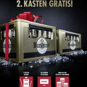 Wer an einem Montag oder Dienstag im September zwei Kästen seiner Lieblingssorte Warsteiner kauft, bekommt das Geld für den zweiten Kasten von Warsteiner zurück. Kauft beim Händler eures Vertrauens oder online zwei Kästen Warsteiner (verschiedene Sorten: 20×0,5l, 24×0,33l, 4x6x0,33l), ladet bis spätestens 15.10.2020 euren Kassenbon auf der ab September verfügbaren Aktionsseite hoch und bekommt den Preis des günstigeren Kastens exklusive Pfand zurückerstattet.
