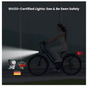 StVZO-zertifizierte Fahrradbeleuchtung & robuster Gepäckträger:Dank der StVZO-zertifizierten Fahrradbeleuchtung am Trekkingrad J1 ST wird die Sichtbarkeit im Straßenverkehr deutlich erhöht, ohne andere Verkehrsteilnehmer zu blenden. Dies sorgt für mehr Sicherheit beim Fahren im Straßenverkehr. Der robuste Gepäckträger erleichtert das Reisen und macht das Fahrrad ideal für Einkäufe, Pendelfahrten und längere Touren.