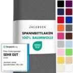 Aktuell erhalten Sie das Jacobson Jersey Spannbettlaken (Größe 180×200 cm und 200×200 cm) in Anthrazit für nur 11,00 EUR auf Amazon. Das Laken besteht aus hochwertiger Baumwolle und sorgt für eine elastische und perfekte Passform auf Ihrem Bett. Es bietet hohen Komfort und eine moderne, schlichte Optik.