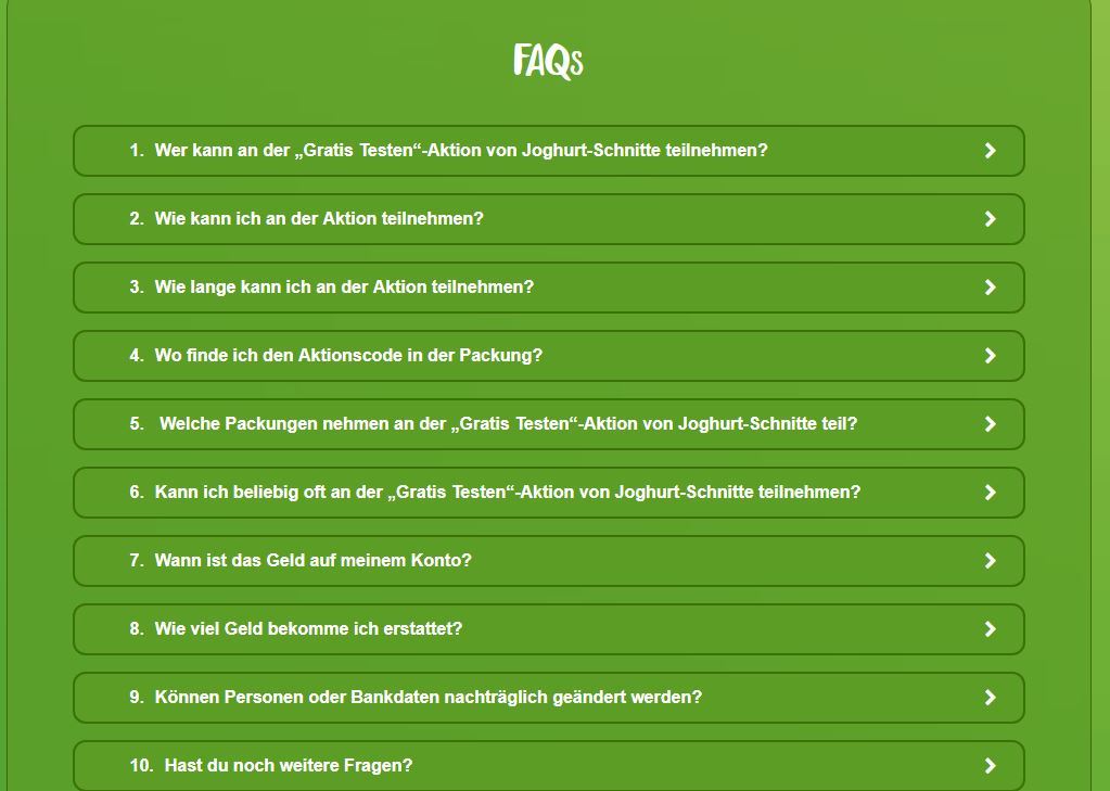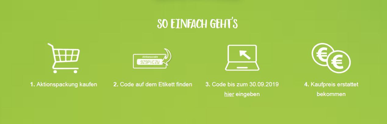 Um an der Aktion teilzunehmen, benötigst du einen Aktionscode. Diesen erhältst du mit dem Kauf einer gekennzeichneten Joghurt-Schnitte , Joghurt-Schnitte Himbeere oder Joghurt-Schnitte Heidelbeere & Cranberry 5er Aktionspackung. Der Code befindet sich unter der Lasche des Etiketts.Anschließend kannst du bis zum 30.09.2019 den Aktionscode unter http://www.joghurt-schnitte.de/gratis-testeneingeben. Der Kaufpreis wird dir per Banküberweisung erstattet. Der Kassenzettel dient als Beleg für deinen Einkauf einer 5er Packung Joghurt-Schnitte , Joghurt-Schnitte Himbeere oder Joghurt-Schnitte Heidelbeere & Cranberry und sollte daher aufbewahrt werden.