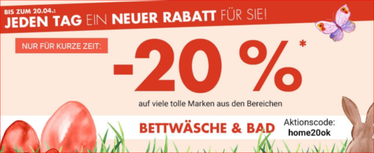 Im Onlineshop von Karstadt bekommt ihr im Osterkalender bis zum 11. April 20% Rabatt auf viele tolle Marken aus dem Bereich Bettwäsche & Bad inkl. Frottierwaren. Nutzt dazu einfach den Gutscheincode home20ok im Warenkorb und der Rabatt wird automatisch abgezogen.