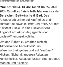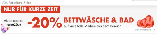 - Bis 11.04.um 24 Uhr erhalten Sie 20% Rabatt auf viele tolle Marken aus den Bereichen Bettwäsche & Bad.