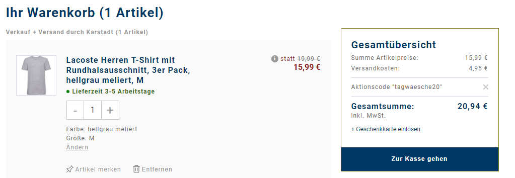 Ich habe es soeben mit dem bereits reduzierten 3er Pack Lacoste Herren T-Shirt mit Rundhalsausschnitt ausprobiert und es hat geklappt (für 15,99€ statt 19,99€ zzlg. Versand – siehe Screenshot). Ein Vergleichspreis ist eher schwierig zu finden, konnte aber bei Idealo nichts günstigeres finden 🙂