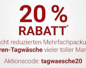 Bei Karstadt im Rahmen der Aktion „2-Tages-Knaller“ erhalten Sie 20% Rabatt auf nicht redzuzierten Mehrfachpackungen Herrenwäsche mit dem Aktionscode tagwaesche20.