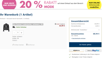 Tayfun 09.06.2019, 07:53 #Ein Beispiel She Damen Lederjacke, schwarz, 38 UVP 129,99 Reduziert auf 79,99 mit 20% Rabatt inkl.Versand für 68,94 oder Filialeabholung für 63,99 Euro.