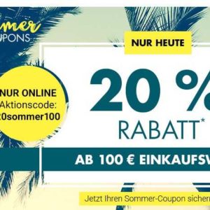 20% Rabatt auf einen Einkauf ab 100 € Einkaufswert. Einmalig gültig am 16.06.2019 bei karstadt.de. Geben Sie den Aktionscode 20sommer100 im Warenkorb ein und der Rabatt wird abgezogen. Nicht nachträglich für bereits gekaufte Ware und nicht in Verbindung mit anderen Aktionsvorteilen einsetzbar. Nicht gültig für Geschenk- / Guthabenkarten, Bücher, Zeitschriften, Elektro, Spielwaren, Fahrräder, Services, Reisen, Vital-Produkte, Möbel, Wein, Multimedia, Spielekonsolen, Videospiele, Aktionsware und folgende nicht teilnehmende Marken: Alpina, Apple, Calvin Klein, Swarovski, Pandora, Engelsrufer, Garmin, fitbit, GHD, Dyson, Amazon, Ravensberger Matratzen, Amorelie. Bei karstadt.de nur gültig für Produkte ausgewiesen mit „verkauft durch Karstadt“.