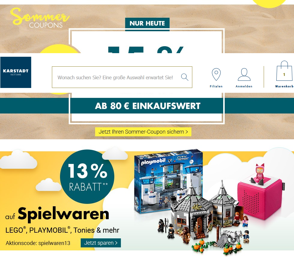Karstadt Sommer Coupons Aktion gültig nur heute auf 15% einen Einkauf ab 80 € Einkaufswert & 13% Rabatt auf Spielwaren(ohne Mindestbestellwert)