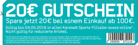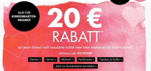 Bei Karstadt nur für Kundenkarteninhaber 20€ Gutschein ab 100€ Einkauf auf einen nicht reduzierter Artikel.