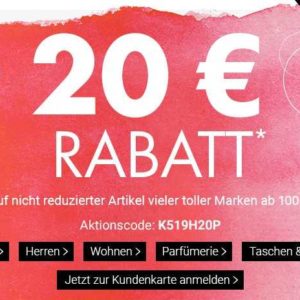 * Einmalig gültig auf einen Einkauf nicht reduzierter Artikel vieler toller Marken ab 100 € bis zum 25.05.2019. Bei karstadt.de gültig für Produkte ausgewiesen mit „verkauft durch Karstadt“. Bei Online-Bestellung melden Sie sich mit Ihrer Karstadt Kunden- oder Kreditkarten-Nummer an und geben den Aktionscode K519H20P im Warenkorb ein. Nicht nachträglich für bereits gekaufte Ware und nicht in Verbindung mit anderen Aktionsvorteilen einsetzbar. Geschenk-/Guthabenkarten, Bücher und Zeitschriften sind stets ausgenommen. Die Bereiche Elektro, Matratzen/Rahmen und Boxspringbetten nehmen nicht an dieser Aktion teil.