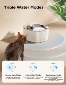 - Der Trinkbrunnen für Katzen hat 3 Arbeitsmodi: ① Bewegung: Beginnt zu arbeiten, wenn eine Bewegung erkannt wird ② Timer: d.h. alle 15 Minuten fließt für 15 Sekunden Wasser aus, und der Zyklus wiederholt sich. ③ Dauerbetrieb: Dauerbetrieb ( (der nur bei eingestecktem Netzteil funktioniert). Der bewegungssensor spart strom und was ihr interesse am trinken stark fördert.