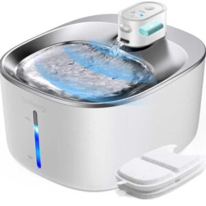 - Das 5-stufige Filtersystem versorgt Ihre Haustiere kontinuierlich mit frischem und gesundem Wasser. 1. Schwamm Haare und Verunreinigungen filtern. 2.Aktivkohle entfernt schlechten Geschmack und Geruch 3.Ionenaustauscherharz könnte das Leitungswasser weich machen 4.Vliesstoff könnte und schwamm verhindert das Eindringen von Verunreinigungen in die Pumpe. Dieser Katzenbrunnen mit Bewegungssensor wird mit einem 2 filter. (Bitte suchen Sie “B0BWMLPMTF“ Ersatzfilter)