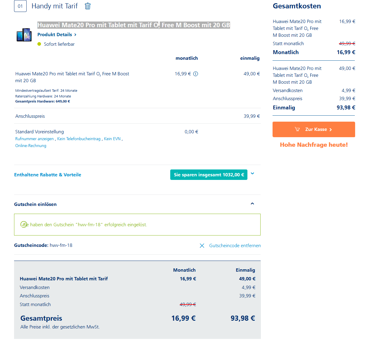 Knaller Angebot von O2 Huawei Mate20 Pro mit Tablet mit Tarif O2 Free M Boost mit 20 GB für 16,99€ statt 34,99€ Grundgebühr um auf dem preis zu kommen Wendet den Gutscheincode: hwv-fm-18 im Gutscheinfeld.