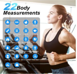 - Großes Farbdisplay: Nach der Verbindung mit der App und der Durchführung der Messungen kann unsere personenwaage mit körperfettanalyse 11 Körperdaten direkt auf dem Farbdisplay anzeigen. Die Daten werden mit Ihrem Smartphone synchronisiert, und in der App können Sie alle 22 Körperdaten einsehen. (Ohne Verbindung zeigt die Waage nur das Gewicht an.)