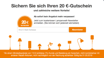 - Gültig bis 07.01.2019 auf eine Bestellung bei Lampenwelt.de aus der Kategorie Wohnraumleuchten mit einem Mindestkaufpreis von 100 €. Nicht gültig für Leuchten der Hersteller Artemide, Escale, Flos und Masiero. Geben Sie einfach den Gutscheincode im Warenkorb ein. Pro Kunde und Bestellung ein Gutschein, nicht kombinierbar mit anderen Rabatt-Aktionen, nicht nachträglich von der Rechnung abziehbar. Bei einem Bestellwert unter 15 € wird ein Mindermengenzuschlag in Höhe von 3 € fällig.