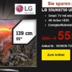 Und noch einen Fernseher zum bisherigen Bestpreis: Bei Conrad bekommt Ihr den LG 55UK6750 LED-TV 139 cm 55 Zoll EEK A+ (DVB-T2, DVB-C, DVB-S, UHD, Smart TV, WLAN, PVR ready, CI+ Schwarz) für 555,-€ statt 599,-€ (der nächste Preis liegt bei 569,-€ bei Saturn laut Idealo).