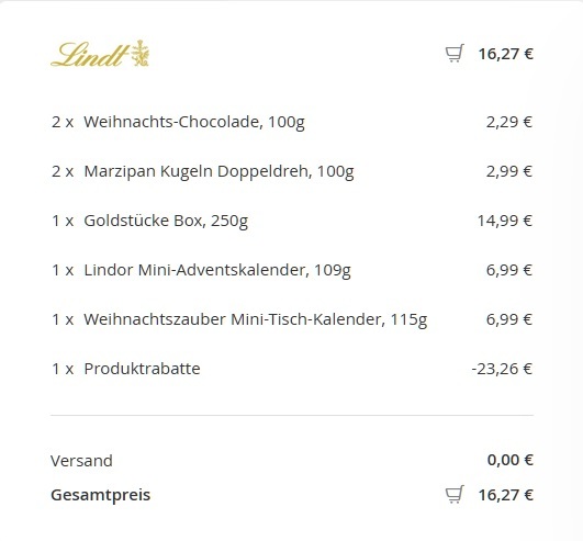 Hallo zusammen,nachdem es seit geraumer Zeit bereits 50% auf die Kalender gab, gibt es nun 75% auf die Kalender und 50% auf alle anderen Weihnachtsartikel bei Lindt.