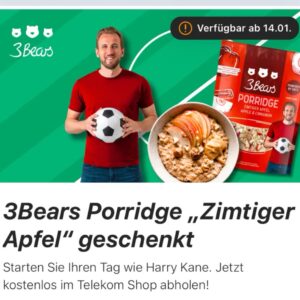Ab 14.01.2025 bekommt man bei Magenta Moments Gratis 3Bears Porridge Zimt Apfel