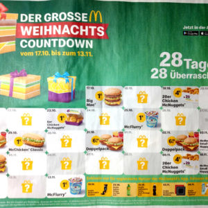 War vorhin fein amerikanisch speisen und da fiel mir die neue Werbung auf dem Tablett auf: Auch in diesem Jahr lässt sich McDonald’s nicht lumpen und macht wieder einen großen Weihnachtscountdown. Etwas früh, aber vom 17.10. bis 13.11. gibt es 28 Tage lang 28 Überraschungen und einige exklusive App-Angebote (unter anderem am 19.10. wieder formschöne Socken 🙂 ).
