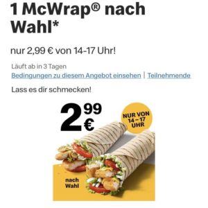 Ihr bekommt einen McWrap nach Wahl für 2,99€. Aber nur 3 Tage lang am nachmittag.