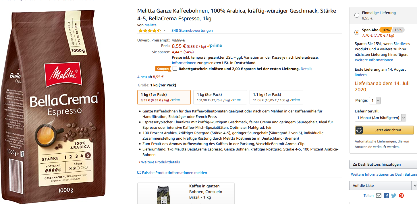 Bei Amazon mit ( -2€ Coupon & -10% ) bekommt man in Sparabo die Melitta Ganze Kaffeebohnen, 100% Arabica, milder Geschmack, leichter Charakter, Stärke 2, BellaCrema Speciale, 1kg für 5,69€ statt PVG ab 10€ inkl.Versand mit Prime