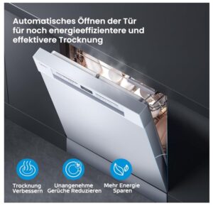 - 【Automatische Öffnung】Diese Funktion ermöglicht eine noch effizientere Trocknung nach dem Spülen, auch bei Kunststoffgeschirr. Diese Funktion kann mit der App ein- und ausgeschaltet werden.
