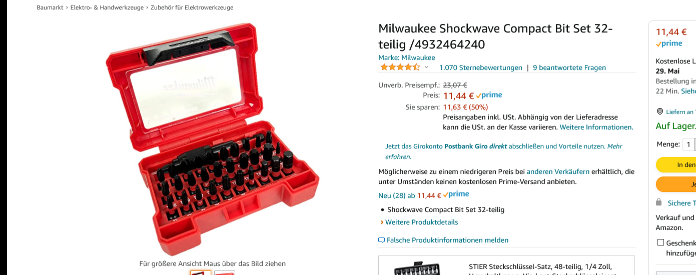 Auf Amazon derzeit Milwaukee Shockwave Compact Bit Set 32-teilig für 11,44€ statt PVG ab 16€ inkl.Versand mit Prime