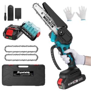 - Die Supstable Einhand Kettensäge verwendet eine hochwertige Führungskette, die einem tiefen Härtungsprozess unterzogen wurde, um einen reibungslosen Schnitt zu gewährleisten. Außerdem verwendet diese Mini-Kettensäge einen reinen Kupfermotor, der sehr leistungsstark ist. Die Schnitteffizienz ist höher und schneller.