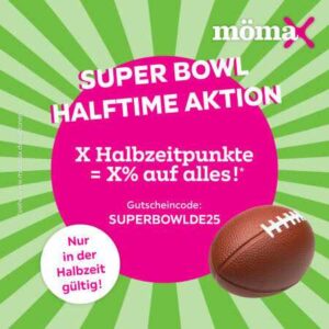 Bei Mömax bekommt ihr während der Halbzeit beim Super Bowl am 09.02.2025 genau so viele Prozente Rabatt, wie bisher Punkte erzielt wurden.