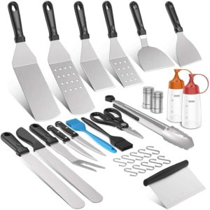 - 【Das vollständigste grillspatel set】Morole Grillspachtel Set enthält 2x Übergroße lange grillspatel, 2x Hamburgerwender ,2x Grillplatten-Schaber, 2x Quetschflaschen, 2x Gewürzdosen 2x Steakmesser, 2x Grillpinsel,1x Bratpfannenspachtel-Zerkleinerer, 1x Brotmesser, 1x Streichpalette, 1x Grillzange, 1x Fleischgabel, 1x Küchenschere, 10x Haken, 1x Tragetasche