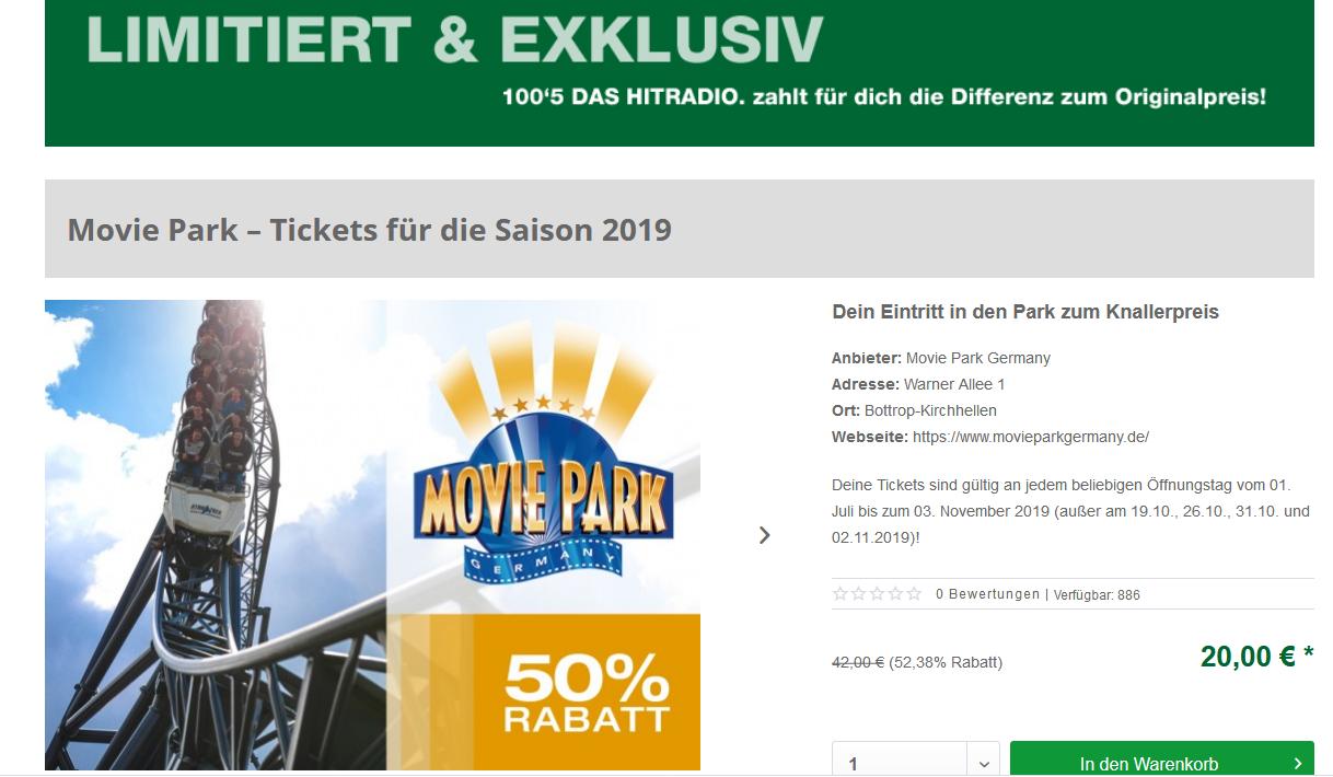 Tip! bei dashitradio.tickets-gutscheine.com bekommt man Tageskarten für Movie Park Germany (50% Rabatt) für 20 € statt 42,00 €.