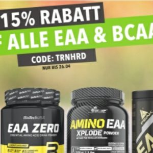 Beim Muskelmacher Shop gibt es 15% Rabatt auf die Aminosäuren EAA & BCAA