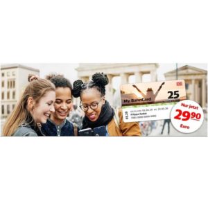 Die My Bahncard 25 gibt es vom 01.04.19 – 31.07.19 (NEU) für 29,90 EUR statt 39,90 EUR für ein 1 Jahr.