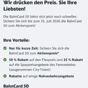 Wir drücken den Preis. Sie Ihre Liebsten!Die BahnCard 50 lohnt sich jetzt noch schneller: Sichern Sie sich bis zum 31. Juli 2026 die BahnCard 50 zum Aktionspreis!