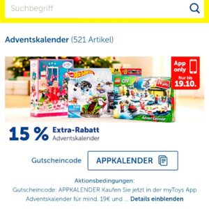 My Toys 15% auf Adventskalender über die App ab 19 € Mindestbestellwert mit dem Code APPKALENDER