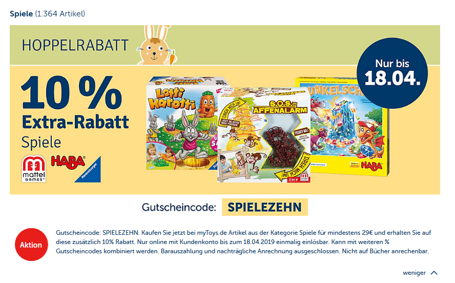 Bei mytoys gibt es 10% Rabatt auf Spielzeug und Spiele mit dem Gutscheincode: SPIELZEHN