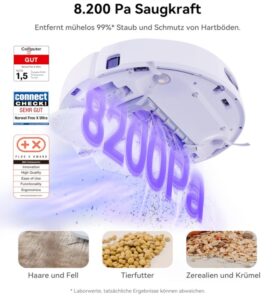 - 8.200 Pa Saugkraft für eine tiefere Reinigung – Verzichten Sie nicht auf Sauberkeit zugunsten von Komfort. Der Freo X Ultra ist ein Saug- und Wischroboter mit einer so starken Saugleistung, dass er Hartböden und Teppiche makellos reinigt. Späne, Fell, Getreide, Staub und Schmutz haben keine Chance – selbst wenn sie tief im Teppich liegen.