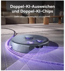 - Ultrapräzise KI-Hindernisvermeidung – Erkennt über 120 Objekte und lokalisiert sie mit millimetergenauer Präzision, um Hindernisse bis hinunter zu 8 mm sicher zu umgehen und so nah wie möglich zu reinigen. Intelligente Wegfindung, Ausweichen vor Hindernissen und nahtloses Manövrieren selbst in komplizierten Hausumgebungen für einen sorgenfreien Betrieb.