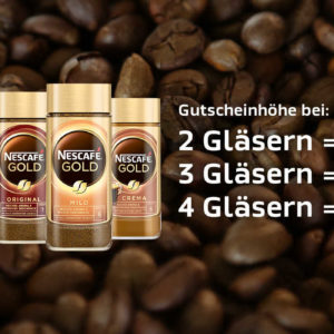 Wer jetzt im Aktionszeitraum in einem Kaufvorgang mehr als 1 Glas „Nescafe Gold“ kauft, erhält folgende Einkaufsgutscheine: