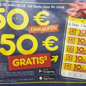 Einkauf in Höhe von 50 Euro rabattfähigem Mindestumsatz am 22. oder 23.12.23 unter Verwendung der Netto App oder der darin verknüpften Deutschland Card. Coupons sind nach abgeschlossenem Einkauf im Coupon-Bereich der Netto-App