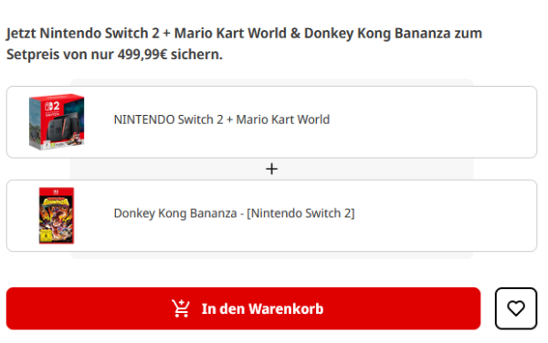 NINTENDO Switch 2 + Mario Kart World + Donkey Kong Bananza für 499,99€.