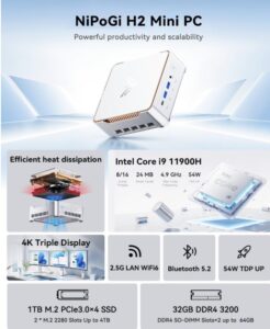 • ⭐【Leistungsstarker Mini PC i9-11900H】Der NiPoGi H2 Mini PC ist mit einem leistungsstarken Ιntel Core i9-11900H Prozessor (8 Kerne und 16 Threads, bis zu 4,9 GHz, 24 MB Ιntel Smart Cache) ausgestattet. Dank 10-nm-SuperFin-Prozessortechnologie und 54 W TDP bietet er leistungsstarke Rechenleistung. Die Leistung ist im Vergleich zum Ryzen 7 6800H/5800H/ i7-11700K/ um über 30 % gestiegen. Ob tägliche Büroarbeit, Multitasking oder komplexe kreative Arbeit – er ist problemlos meisterbar.
