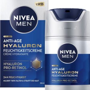 - LIEFERUMFANG & DETAILS – NIVEA MEN Anti-Age Hyaluron Feuchtigkeitscreme mit LSF 15, 50 ml, Hautpflege für Männer mit Anti-Aging Effekt, Creme mit Hyaluron, Pro-Retinol und LSF 15, Artikelnummer 83969