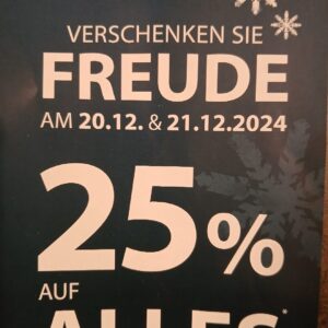 25% auf alles bei NKD ab 19. Dezember schon online. 20. und 21. Dezember auch in den Filialen.