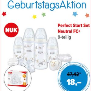 Bei BabyOne bekommt man diese Woche bis zum 05.12.2018 das 9-teilige Perfect Start Set Neutral FC+ von NUK für nur 18,–€. Nur solange der Vorrat reicht (online und in den Filialen).