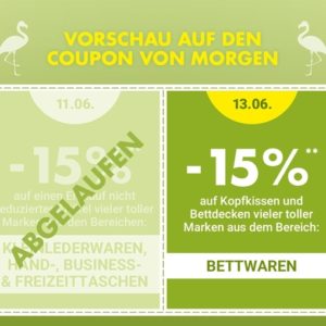Nur am 13.06. bis 24 Uhr: 15% Rabatt auf Kopfkissen und Bettdecken aus dem Bereich Bettwaren. Das Angebot gilt online auf kaufhof.de und karstadt.de sowie in Ihrer GALERIA Karstadt Kaufhof Filiale. In den Filialen ist das Angebot am Aktionstag (gemäß der Ladenöffnungszeit) gültig. Um den Rabatt zu erhalten, einfach Aktionscode home15sc im Warenkorb eingeben und auf „einlösen“ klicken. Nicht mit anderen Rabatten kombinierbar. Ausgeschlossen sind f