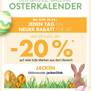 Nur am 11.04. 18 Uhr bis 12.04. 24 Uhr: 20% Rabatt auf viele tolle Marken aus dem Bereich Jacken. Das Angebot gilt online auf kaufhof.de und karstadt.de sowie in Ihrer GALERIA Kaufhof Karstadt Filiale. In den Filialen ist das Angebot am Aktionstag (gemäß der Ladenöffnungszeit) gültig. Um den Rabatt zu erhalten einfach Aktionscode jacken20ok im Warenkorb eingeben und auf „einlösen“ klicken. Nicht mit anderen Rabatten kombinierbar. Ausgeschlossen sind folgende Marken: http://www.kaufhof.de/svp.