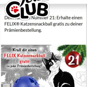 Jedes Mitglied im FELIX Club erhält bei seiner Prämienbestellung am 21.12.2020 einen FELIX® Katzensnackball gratis dazu. Die gratis Zugabe kann nur einmalig, mit der ersten Bestellung am Aktionstag erhalten werden. Die Aktion ist auf 3.000 Stück beschränkt.