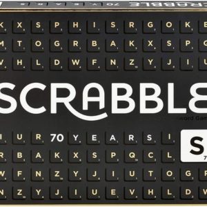 Scrabble ist seit Generationen beliebt und wird immer neu gestaltet, um mit der Zeit zu gehen. Darum wird jetzt die Scrabble-Ausgabe zum 70. Jubiläum in einem klaren, modernen Design vorgestellt. Die eleganten schwarzen Spielsteine haben im Foliendruck aufgedruckte Buchstaben, auf dem schwarzen Spielbrett sind Prämienfelder im Foliendruck. Außerdem hat die Packung dieser limitierten Ausgabe eine geprägte Vorderseite mit Foliendruck.