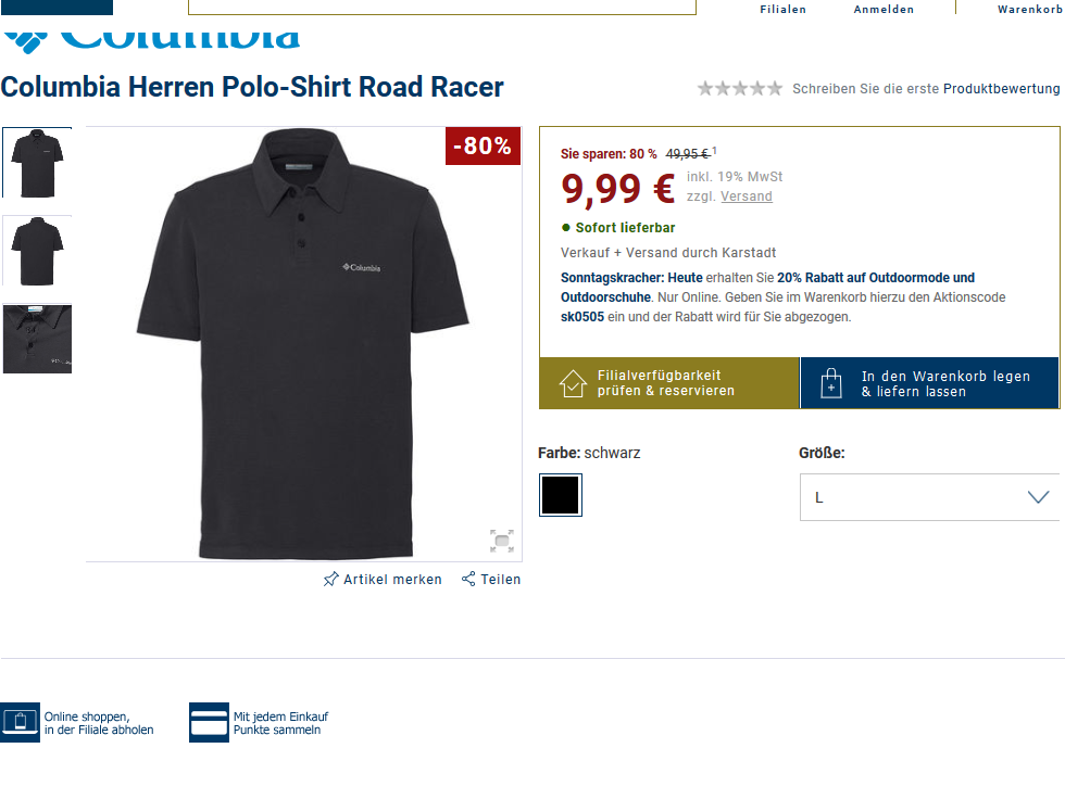 Ein Beispiel: Columbia Herren Polo-Shirt Road Racer Gr.M,l,xl,xxl mit Gutscheincode:sk0505 für 7,99 Euro PVG ab 34,00 Euro! (bei Filialeabholung)