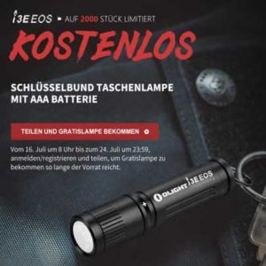 Bei Olight bekommt ihr gerade ein kostenloses Schlüsselband + Taschenlampe komplett kostenlos. Einfach in den Warenkorb legen und bestellen.